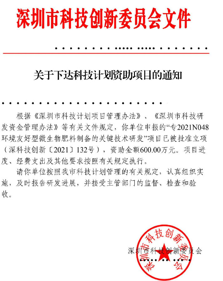 近日,深圳市科技创新委员会网站公布了2021年可持续发展科技专项项目的资助名单。深圳市芭田生态工程股份有限公司申报的“专2021N048 环境友好型微生物肥料制备的关键技术研发”项目获得600万元资助。