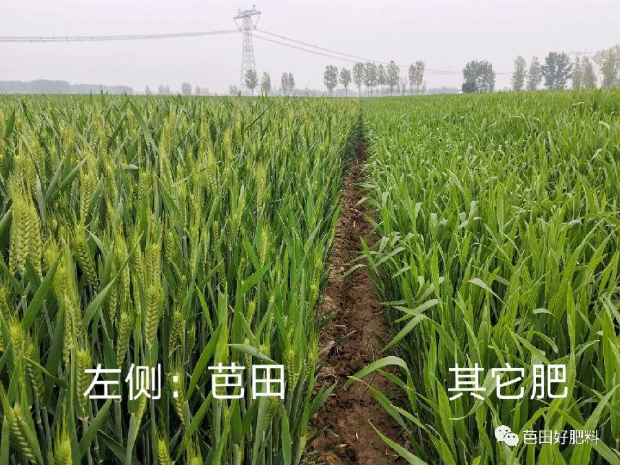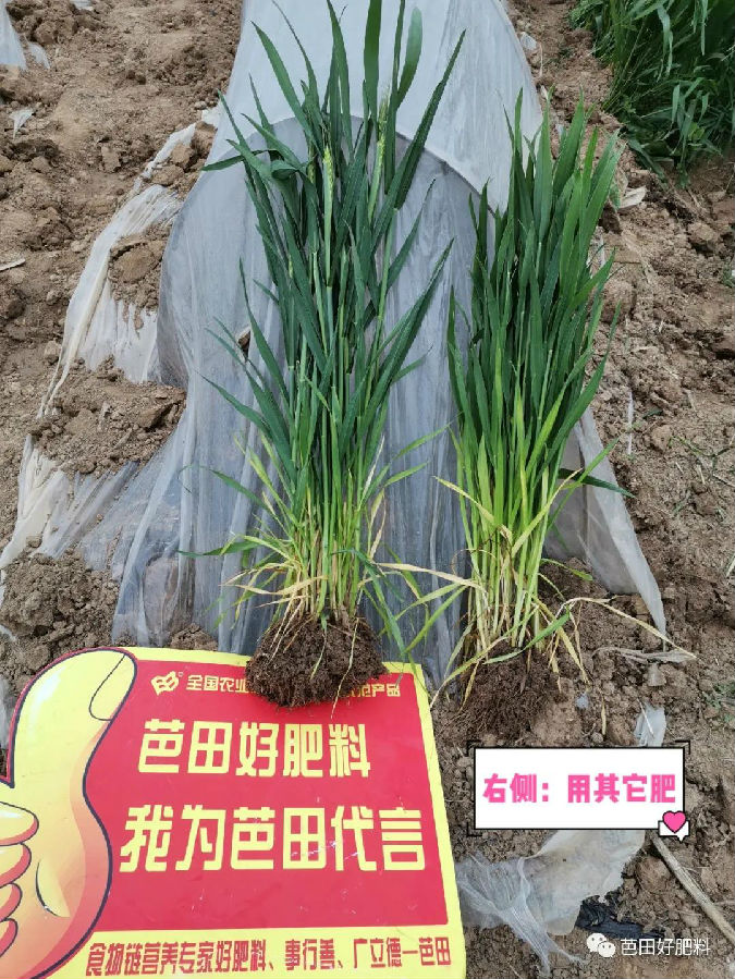 右侧:用芭田复合肥的小麦,分蘖多,根系明显发达,茎秆明显粗壮,叶片嫩绿厚实,抗倒伏能力强;左侧:用其他品牌复肥的小麦茎秆底部黄叶多,抗倒伏能力差