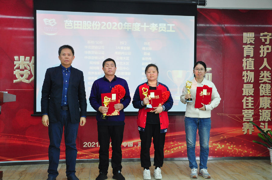 会议当天,芭田2020年度十孝员工受到了表彰。芭田负责人表示,“孝”文化是我国的传统美德,多年来,芭田引入“孝”的爱敬文化,让员工“知孝、行孝、传播孝”,在家里要孝敬父母,在公司要尊敬领导,爱护同事,走向社会,要尊老爱幼,爱护他人,感恩社会。近年来,芭田孝文化得到了广泛传播,受到了经销商和行业人士的一致好评。