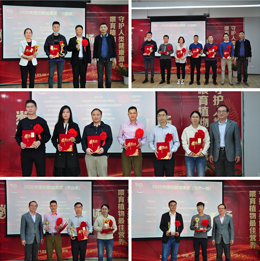 2020年,公司创新成果硕果累累,在硝酸磷肥工艺的核心技术上、干法选矿技术提升上、功能产品创新技术开发等技术上取得了突破性进展。会上,对于过去一年成绩优秀的创新员工、团队、研发平台创新成果、生产一线创新成果,公司分别进行了奖励,并颁发了相关证书,充分践行了公司“创造价值、分享红利”的价值观。