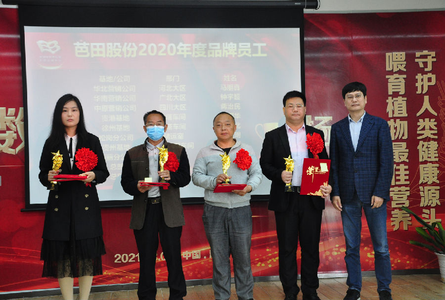 会上,受到公司表彰和奖励的还有芭田2020年年度品牌员工,他们来自芭田生产、营销、研发、后勤等系统,他们耕耘在最普通的工作岗位上,他们用自信和担当,以一己之力扛起责任和压力,他们用创新和共享,攻破工作中的重重难关,他们是芭田员工的精神名片,是被大家共同认可的品牌员工。